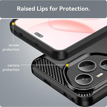 Pouzdro se pyšní moderním a sofistikovaným designem. Zadní strana je opatřena jemnou texturou imitující broušený kov, která dodává pouzdru prémiový vzhled a zároveň zlepšuje úchop. Horní a spodní část, stejně jako precizní výřez kolem modulu fotoaparátu, zdobí dynamická textura karbonových vláken, která podtrhuje sportovní eleganci a odolnost. Díky použití kvalitního silikonu je pouzdro příjemné na dotek, flexibilní a zároveň poskytuje spolehlivou ochranu proti nárazům a poškrábání.