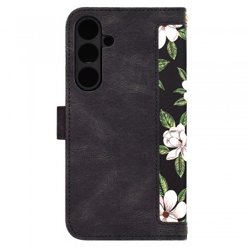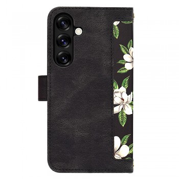 Pouzdro se pyšní sofistikovaným designem s motivem bílých květin a zelených listů na elegantním černém podkladu, který evokuje klid a krásu úsvitu. Je vyrobeno z kvalitní syntetické kůže, která je příjemná na dotek a odolná proti opotřebení. Vnitřní strana pouzdra nabízí praktické přihrádky na karty a bankovky, což z něj činí ideálního společníka pro každodenní nošení. Bezpečné uzavření zajišťuje magnetická spona a pro pohodlné nošení je součástí balení i praktické poutko na zápěstí. Telefon je pevně uchycen v precizně tvarované silikonové vaničce, která chrání boky a rohy zařízení.
