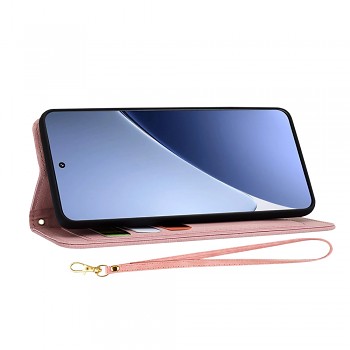 Pouzdro se pyšní sofistikovaným designem, kde se snoubí jemný růžový odstín s živým květinovým vzorem. Vzor na přední straně a části zadní strany zdobí květy v odstínech žluté, růžové a bílé, doplněné zelenými listy a červenými bobulemi na světlém pozadí, což dodává pouzdru svěží a romantický vzhled. Vnější materiál imituje texturovanou kůži, která je příjemná na dotek a zároveň odolná proti každodennímu opotřebení.