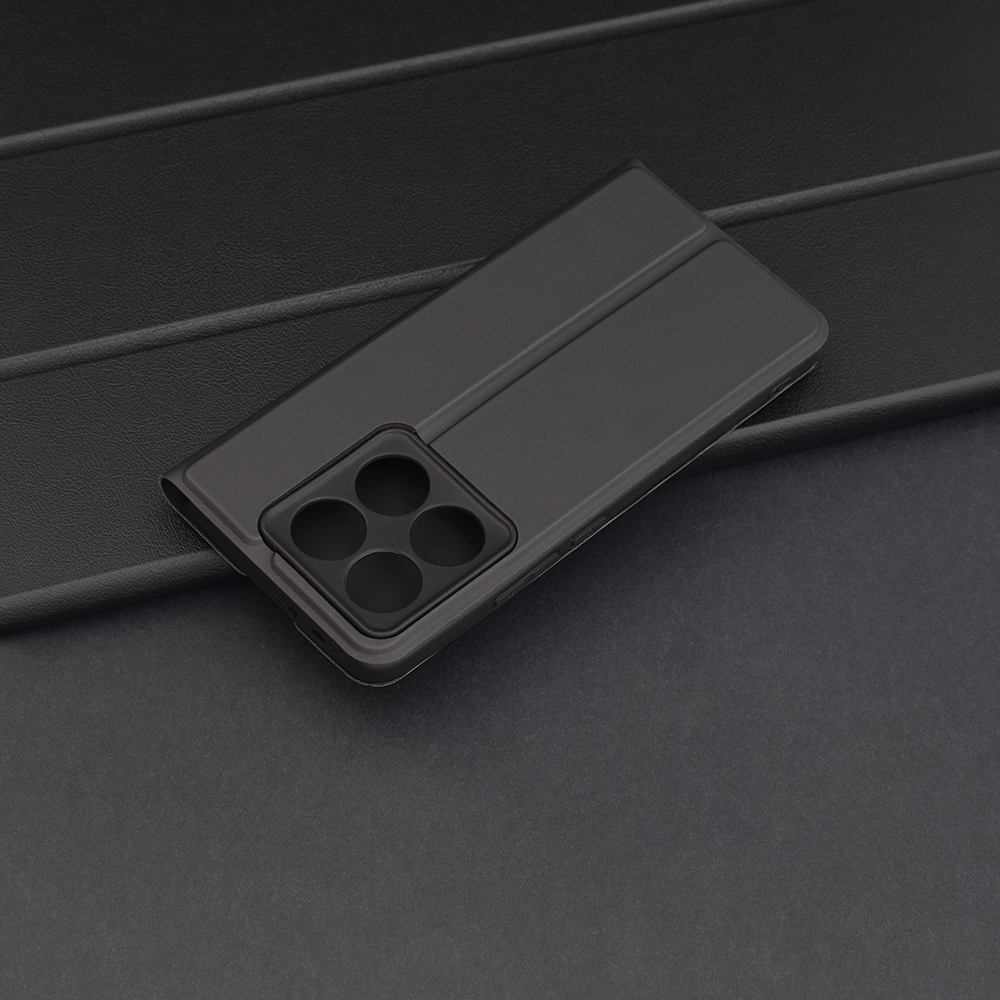 Pouzdro Techsuit Magskin Book se vyznačuje minimalistickým a sofistikovaným designem. Jeho matný povrch v černé barvě působí elegantně a je příjemný na dotek, zároveň odolává otiskům prstů a drobným škrábancům. Jedná se o typ "book" pouzdra, které chrání telefon ze všech stran, včetně displeje, díky uzavíratelné přední klopě. Klopa je navržena tak, aby se dala snadno otevřít a zavřít, což zajišťuje rychlý přístup k telefonu. Na zadní straně pouzdra je precizně zpracovaný výřez pro modul fotoaparátu, který dokonale kopíruje jeho tvar a chrání čočky před poškozením, aniž by omezoval jejich funkčnost. Vnitřní strana pouzdra je pravděpodobně opatřena měkkým materiálem, který zabraňuje poškrábání telefonu. Celkové zpracování pouzdra podtrhuje důraz na detail a kvalitu, což je pro značku Techsuit typické.