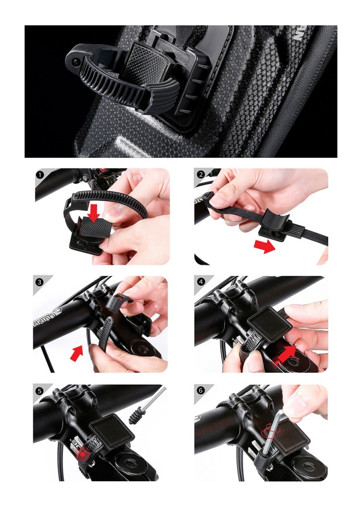 Při montáži je třeba upevnit pásky s čtvercovou hlavicí na představec kola pomocí přídavných šroubků. Poté zasuňte čtvercovou část na zadní straně pouzdra do příslušného místa na hlavici až uslyšíte "cvaknutí". Pro vyjmutí pouzdra z držáku stačí zmáčknout plastové tlačítko ze zadní strany pouzdra. Pouzdro je možné nasunout na hlavici horizontálně nebo vertikálně.