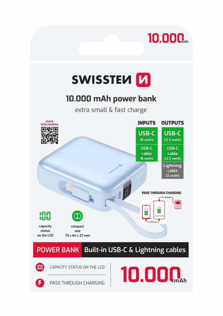 Powerbank Swissten Space 10000 mAh s integrovanými kabely usb-c a lightning modráPraktická záložní baterie s integrovanou kabeláží pro okamžité doplnění energie. Obsahuje vestavěný USB-C i Lightning kabel a přehledný LCD displej informující o stavu baterie.