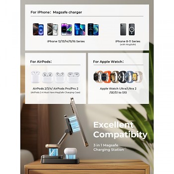 Produkt je určen pro mobilní telefony s podporou bezdrátového nabíjení, sluchátka Apple AirPods a hodinky Apple Watch.