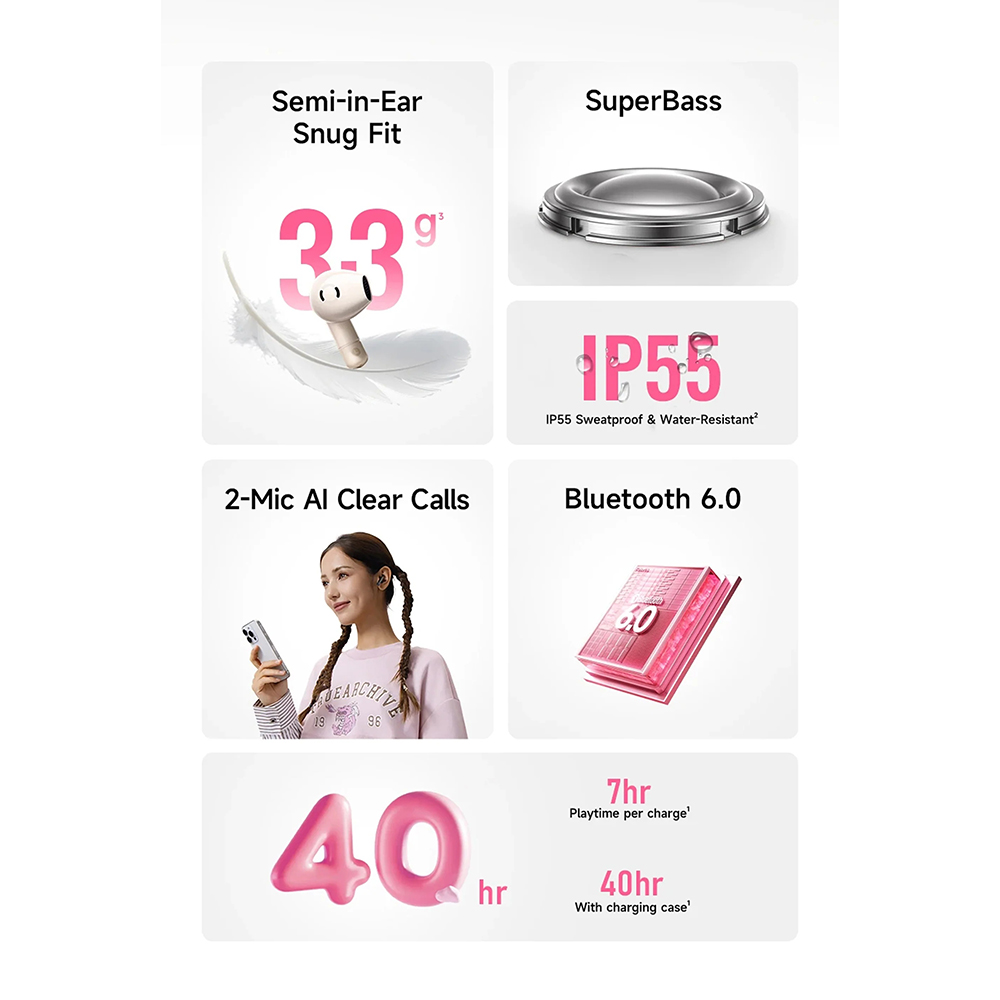 O značce: Inovativní čínská značka Baseus, jejíž název vychází z hesla „Based on user“, se na trhu pohybuje více než dekádu. Aplikace a softwarové inovace této společnosti pravidelně vylepšují zvukový zážitek prostřednictvím plynulých aktualizací ekvalizéru.