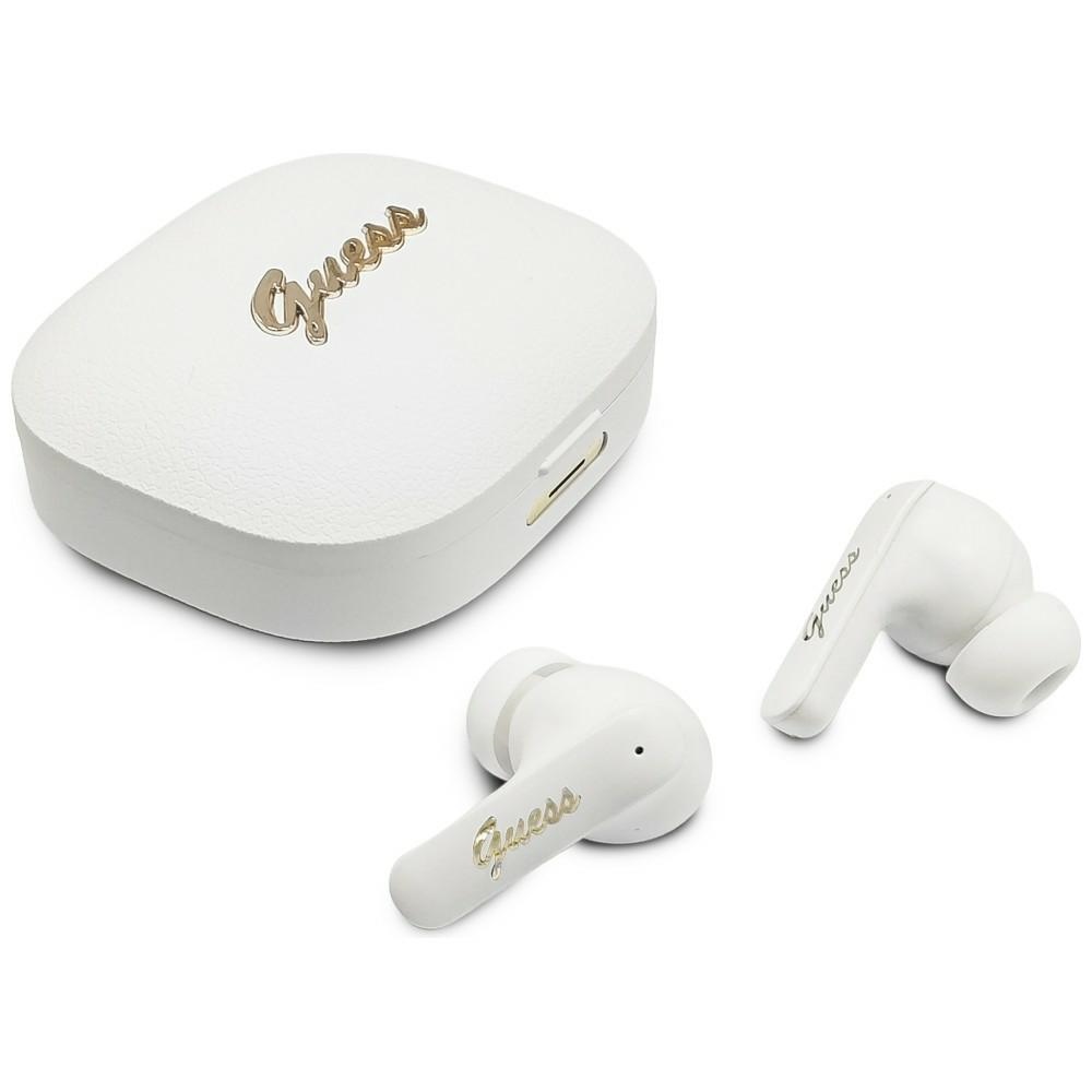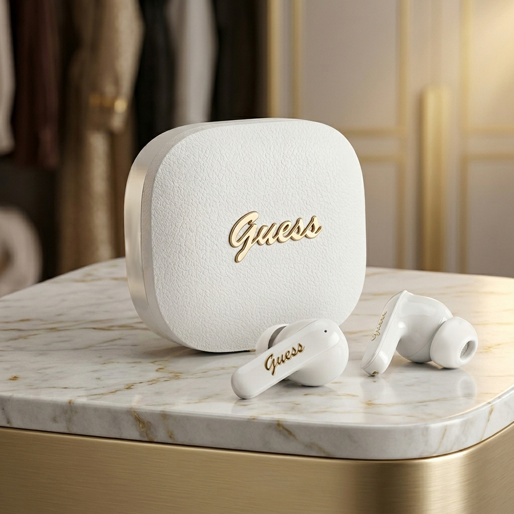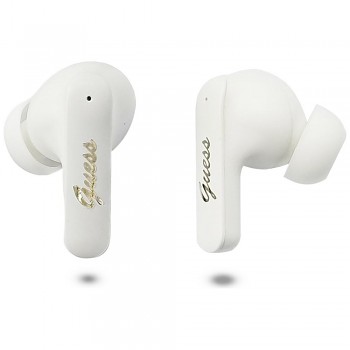 Bezdrátová sluchátka Guess Script Metal Logo (GUTWSX45PGSH) bíláSluchátka disponují čistým ergonomickým designem. Nabíjecí pouzdro v lesklé bílé úpravě zdobí kontrastní zlatavý nápis Guess ve stylu vintage script. Kompaktní rozměry zajišťují pohodlné nošení.