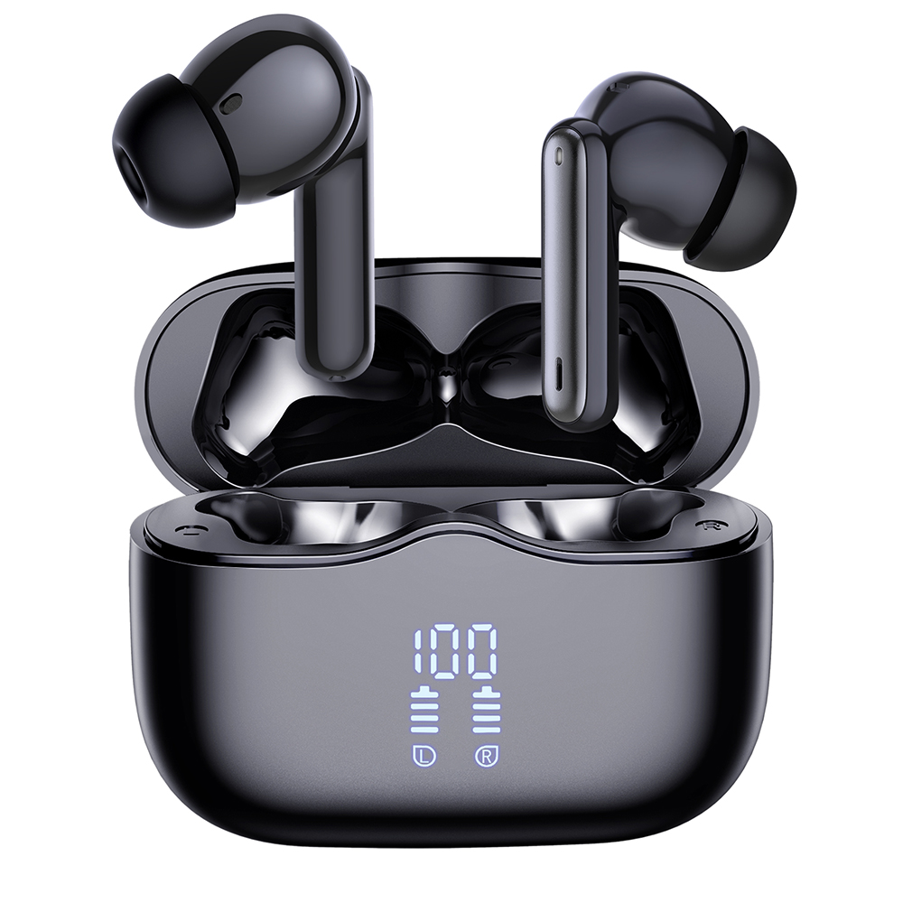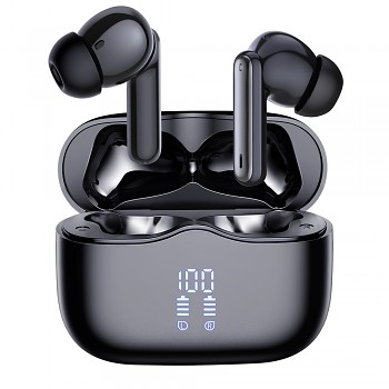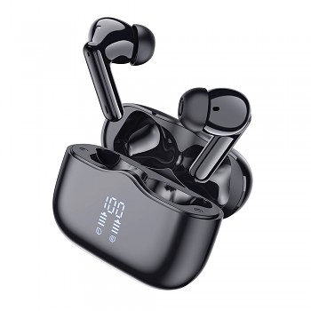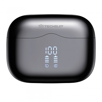 Sluchátka VelarX One se pyšní minimalistickým a sofistikovaným designem v elegantní černé barvě. Samotná sluchátka mají ergonomický tvar s lesklým povrchem a silikonovými špunty, které zajišťují pohodlné a stabilní usazení v uchu pro dlouhodobé nošení. Nabíjecí pouzdro je kompaktní a oválné, rovněž v lesklé černé barvě, což z něj činí stylový doplněk. Na přední straně pouzdra naleznete přehledný digitální displej, který zobrazuje aktuální stav nabití pouzdra i jednotlivých sluchátek (L/R), takže budete mít vždy přehled o zbývající energii. Logo značky Techsuit je decentně umístěno na víku pouzdra. Pro nabíjení je pouzdro vybaveno moderním USB-C portem na spodní straně.