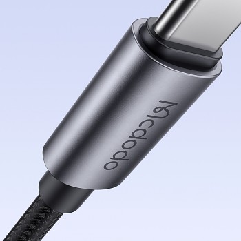 Kabel Mcdodo CA-5710 se pyšní odolným opleteným nylonovým povrchem v černé barvě, který zajišťuje dlouhou životnost a minimalizuje zamotávání. Konektory USB-C a Lightning jsou opatřeny elegantním kovovým pouzdrem v tmavě šedé barvě, které dodává kabelu prémiový vzhled a pocit. Na pouzdře USB-C konektoru je decentně vyraženo logo Mcdodo.