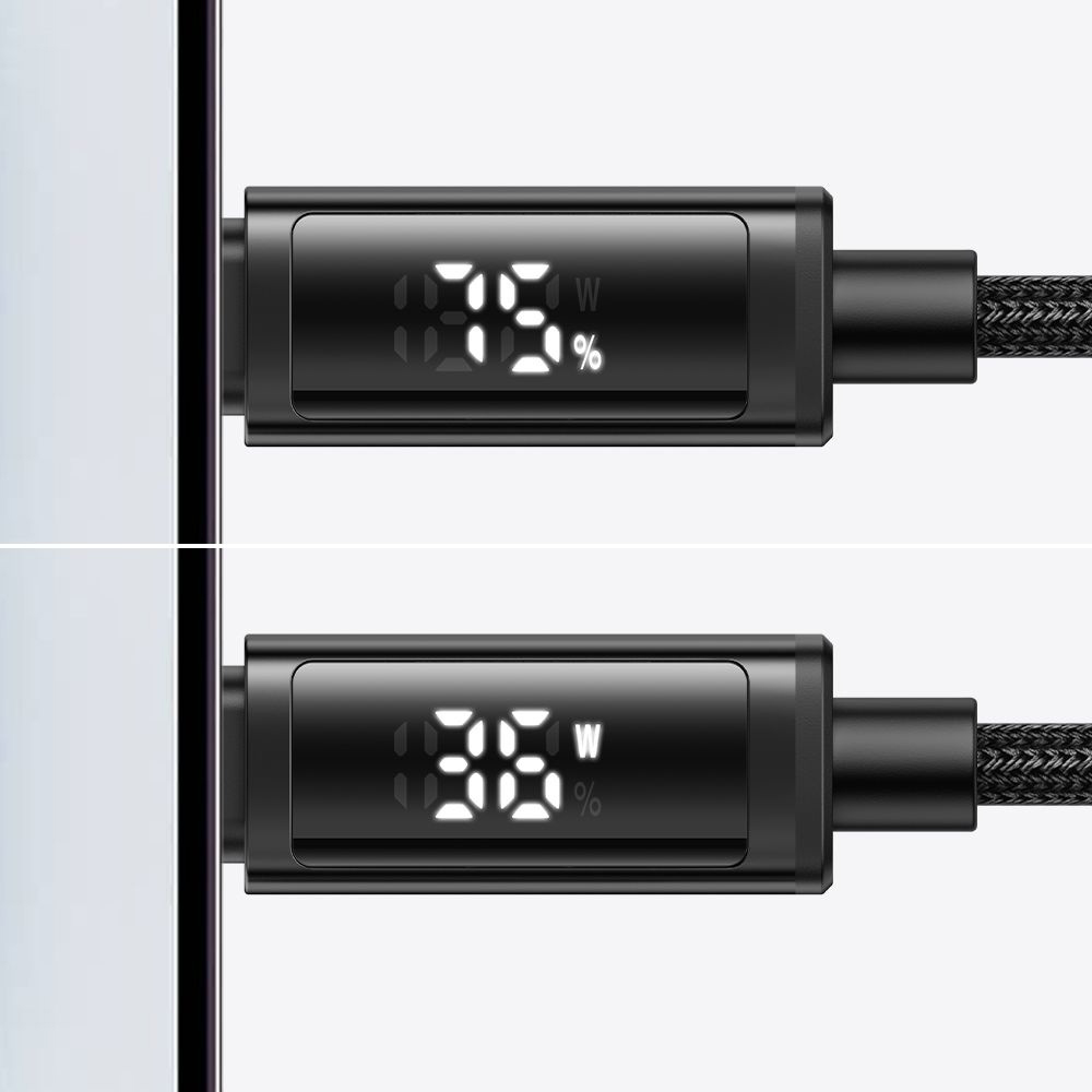 Kabel Mcdodo CA-7970 se pyšní prémiovým designem, který kombinuje estetiku s praktičností. Jeho odolné opletení zajišťuje dlouhou životnost a zabraňuje zamotávání, což oceníte při každodenním používání. Nejvýraznějším prvkem je duální LED displej integrovaný přímo v konektoru Lightning. Tento displej vám v reálném čase zobrazuje aktuální nabíjecí proud (3A) a stav nabití v procentech, což vám poskytuje dokonalý přehled o procesu nabíjení vašeho zařízení. Konektory jsou robustní a precizně zpracované, což zaručuje stabilní a bezpečné připojení.