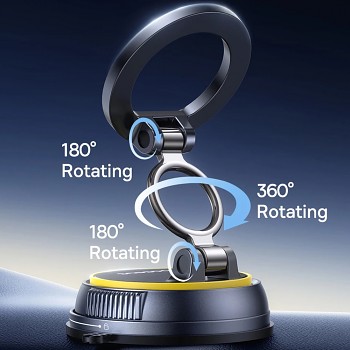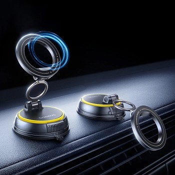 Držák se pyšní moderním a minimalistickým designem v elegantní černé barvě, který skvěle zapadne do interiéru každého vozu. Jeho hlavní část tvoří kruhový magnetický držák s decentním nápisem "DESIGNED BY BASEUS", který zajišťuje pevné a stabilní uchycení telefonu. Celá konstrukce je skládací a nastavitelná, což umožňuje snadné přizpůsobení úhlu pohledu pro optimální viditelnost. Základna držáku je vybavena silnou přísavkou s vakuovým zámkem, která zaručuje extrémně pevné uchycení na palubní desku nebo čelní sklo. Jemný žlutý akcent kolem základny dodává držáku šmrnc a podtrhuje jeho prémiový vzhled.