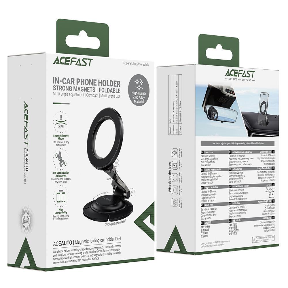Držák do auta magnetický Acefast D64 skládací černýTento produkt má sofistikovaný trojosý skládací design. Jeho masivní černé kovové tělo lze plně složit tak, aby na palubní desce zabíralo absolutní minimum místa, když není používáno.