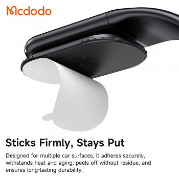 Držák Mcdodo CM-6270 se pyšní minimalistickým a moderním designem. Jeho tělo je vyrobeno z odolného materiálu v elegantní černé barvě, která se snadno sladí s jakýmkoli interiérem vozu. Klíčovou vlastností je jeho ohýbatelný design, který umožňuje snadné nastavení ideálního pozorovacího úhlu pro váš telefon. Díky tomu můžete mít navigaci nebo hudbu vždy na očích, aniž byste museli odvracet pozornost od řízení. Základna držáku je vybavena silnou lepicí vrstvou, která zajišťuje pevné a stabilní uchycení na palubní desce, odolávající teplu i opotřebení, a lze ji odstranit bez zanechání zbytků.
