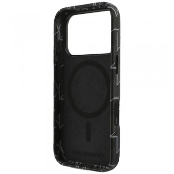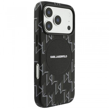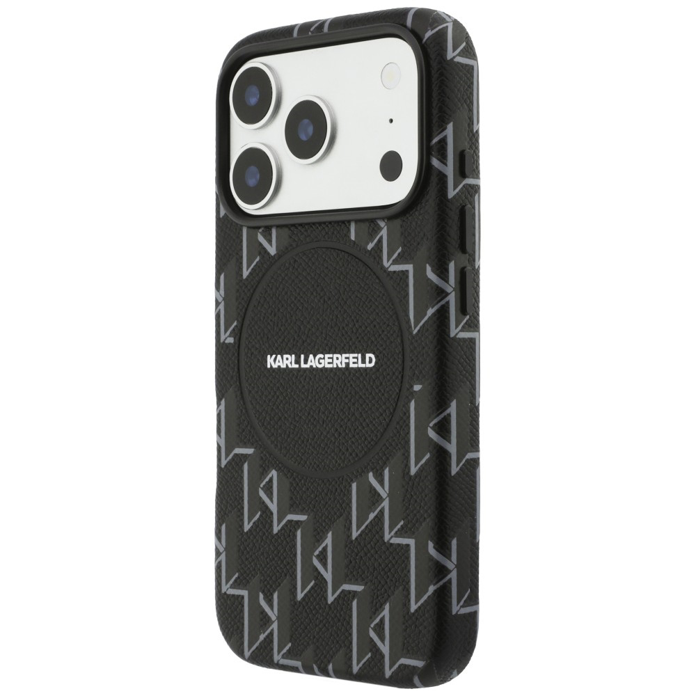 Kryt Karl Lagerfeld Leather KL Monogram Logo MagSafe pro iPhone 17 Pro Max černýDesign krytu staví na luxusním koženém vzhledu v sytě černé barvě, kterému dominuje celoplošný embosovaný monogram KL. Spodní část je doplněna o nenápadné, ale zřetelné logo samotného návrháře.