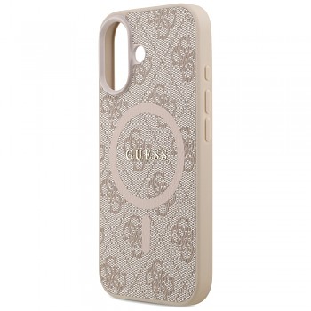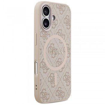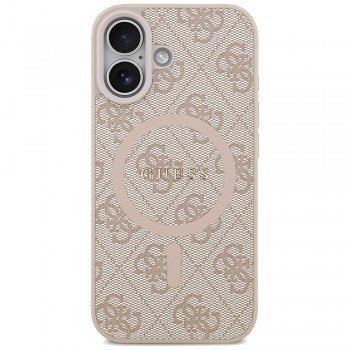 Design krytu okamžitě upoutá pozornost díky ikonickému celoplošnému monogramu 4G, který je jemně vyražen do povrchu a dodává pouzdru sofistikovaný vzhled. Centrální prvek tvoří výrazný kruhový prstenec s integrovanou technologií MagSafe, který zajišťuje bezproblémové a pevné připojení MagSafe příslušenství a rychlé bezdrátové nabíjení. Uprostřed prstence se hrdě vyjímá zlaté logo GUESS, které je symbolem prestiže a módního vkusu. Kryt je vyroben z odolného materiálu, který chrání telefon před poškrábáním, nárazy a běžným opotřebením, zatímco přesné výřezy zajišťují snadný přístup ke všem portům a tlačítkům. Hladké růžové okraje pouzdra doplňují celkový design a zajišťují pohodlné držení.