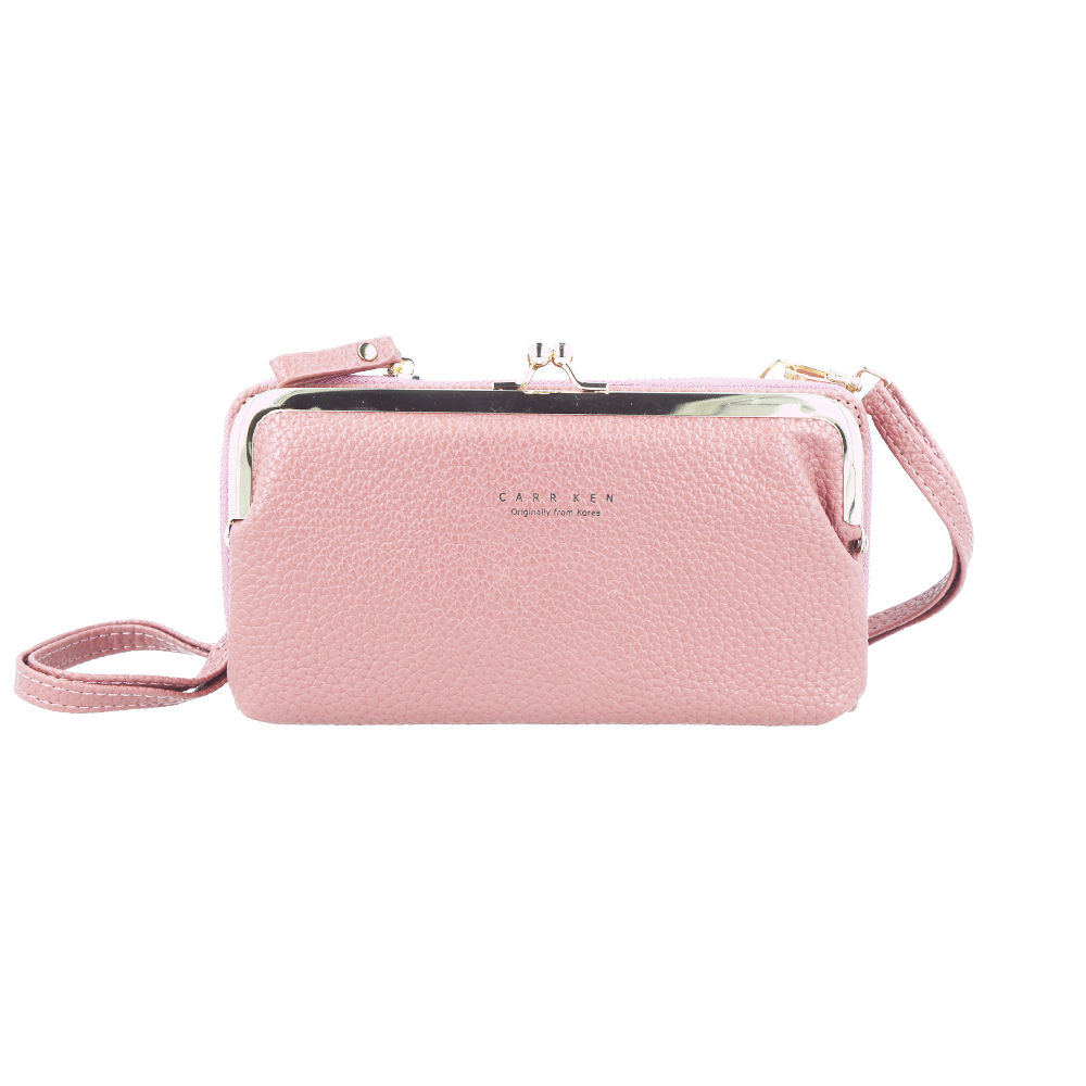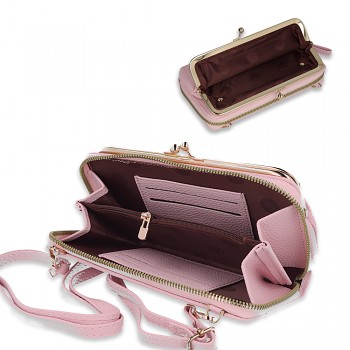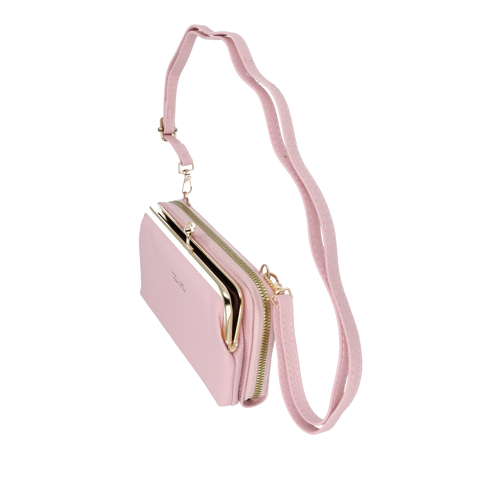 Design pouzdra je inspirován **nadčasovou elegancí** a **minimalistickými liniemi**. Je vyrobeno z **kvalitní umělé kůže** s jemnou texturou, která mu dodává luxusní vzhled a příjemný pocit na dotek. Světle růžový odstín je **jemný a univerzální**, snadno kombinovatelný s různými outfity. Hlavní přihrádka je opatřena **elegantním kovovým zapínáním na klip ve zlatém tónu**, které nejen skvěle vypadá, ale také bezpečně chrání obsah. Pouzdro doplňuje **praktický odnímatelný ramenní popruh**, díky kterému jej můžete nosit jako malou kabelku přes rameno nebo crossbody.