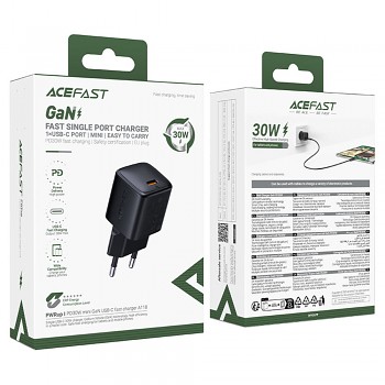 Srdcem této nabíječky je inovativní GaN technologie, která umožňuje dosáhnout vysokého výkonu 30W Power Delivery (PD30W) v neuvěřitelně malém těle. To znamená extrémně rychlé nabíjení pro vaše zařízení, aniž byste museli obětovat místo v tašce nebo na prodlužovacím kabelu. Nabíječka je vyvedena v matně černé barvě, která jí dodává sofistikovaný a moderní vzhled. Její čisté linie a zaoblené hrany podtrhují mini design, který se snadno vejde do každé zásuvky, aniž by blokoval okolní porty. Na přední straně je decentně umístěno logo Acefast a jeden USB-C port s oranžovým vnitřkem, který signalizuje podporu rychlého nabíjení.