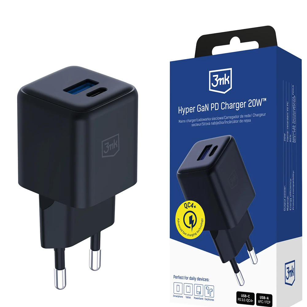 3mk - nástěnná nabíječka Hyper - USB-A, USB-C, technologie GaN, QC4 + PD, 20W - černáPředstavujeme vám 3mk Wall Charger Hyper, kompaktní a výkonnou nástěnnou nabíječku, která přináší revoluci v rychlosti a efektivitě nabíjení vašich zařízení. Díky pokročilé GaN technologii a podpoře standardů QC4+ a Power Delivery (PD) získáte maximální výkon 20W v elegantním a minimalistickém balení. Už žádné dlouhé čekání – vaše zařízení budou nabita bleskovou rychlostí.