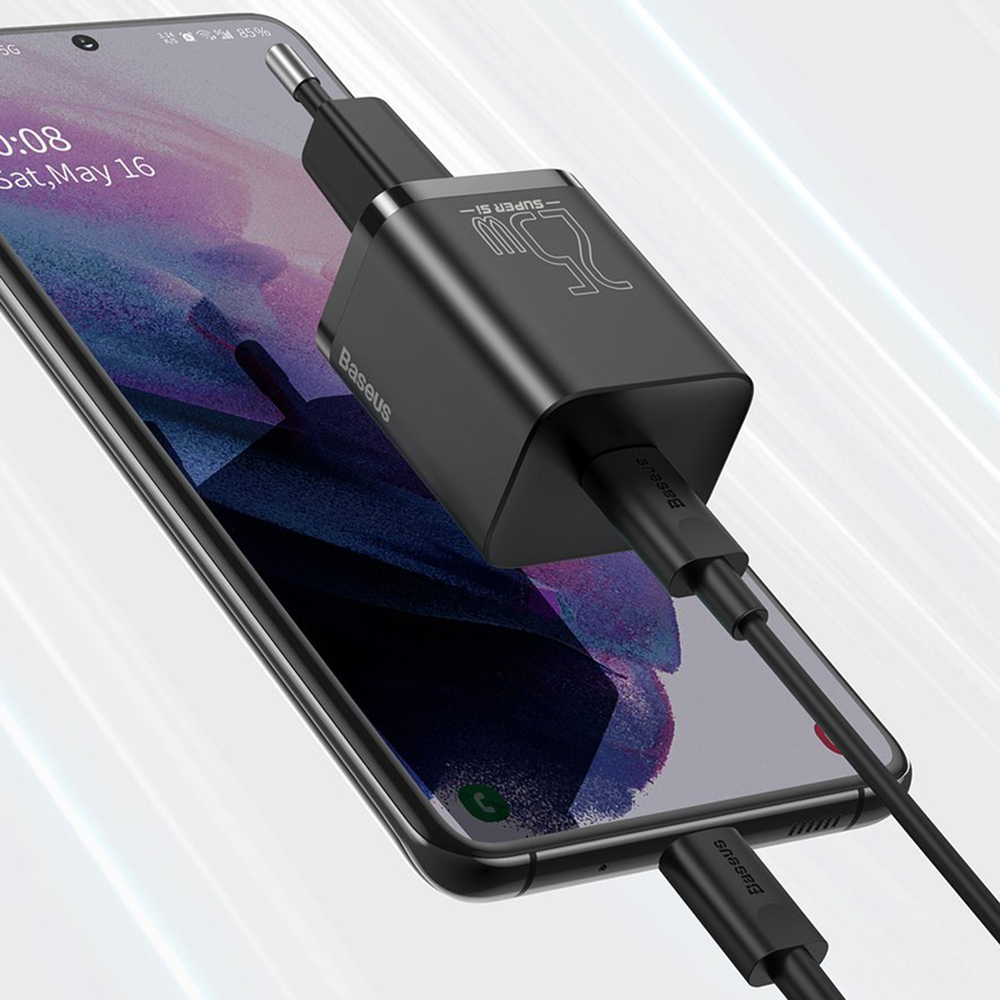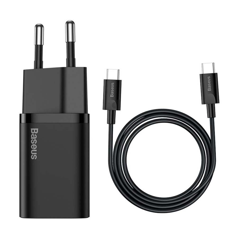 Nabíječka Baseus Super Si se pyšní minimalistickým a moderním designem v matně černé barvě, která jí dodává prémiový vzhled. Její kompaktní rozměry a zaoblené hrany zajišťují, že se snadno vejde do každé tašky nebo kapsy. Na těle nabíječky je decentně vyraženo logo "Baseus" a označení "25W - SUPER SI -", které podtrhuje její technologickou vyspělost. Součástí balení je i odolný 1m dlouhý kabel USB-C na USB-C ve stejné černé barvě, s logem Baseus na konektorech, což zaručuje kompletní a stylové řešení pro vaše nabíjení.