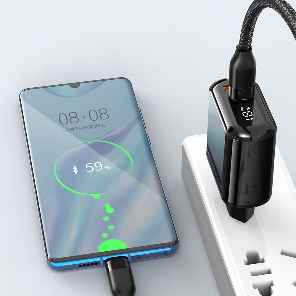 Nabíječka Mcdodo CH-7170 se pyšní minimalistickým a elegantním designem s hladkým černým povrchem a zaoblenými hranami, které skvěle padnou do ruky i do každého interiéru. Její kompaktní rozměry zajišťují, že nezabere mnoho místa v zásuvce ani v cestovním zavazadle. Klíčovým prvkem je integrovaný digitální displej, který v reálném čase zobrazuje aktuální výkon nabíjení ve wattech (W) a indikátor Power Delivery (PD), což vám poskytuje dokonalý přehled o procesu nabíjení. Nabíječka je vybavena dvěma výstupními porty: jedním USB-C a jedním USB-A, což umožňuje nabíjet dvě zařízení současně. Oranžové vnitřní provedení USB-A portu naznačuje podporu rychlého nabíjení.