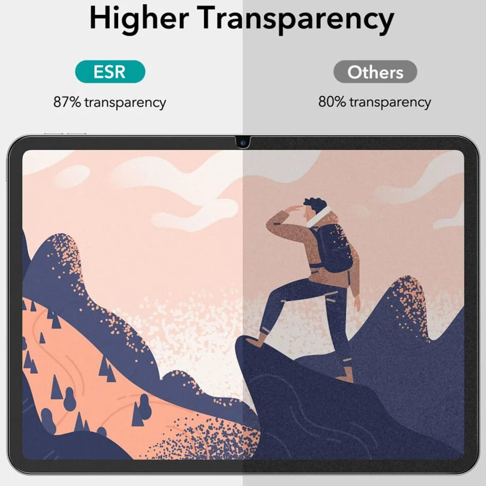 Fólie ESR Paper-Feel je precizně vyrobena tak, aby dokonale padla na displej vašeho iPadu. Její průhledný design zachovává původní barvy a ostrost displeje, zatímco matný povrch dodává jedinečný taktilní zážitek. Balení obsahuje dvě fólie, což vám poskytuje zálohu nebo možnost výměny po delší době používání. Součástí balení je také praktický instalační rámeček, který zaručuje snadnou a přesnou aplikaci bez bublin. S 87% průhledností nabízí ESR lepší vizuální zážitek ve srovnání s běžnými fóliemi.