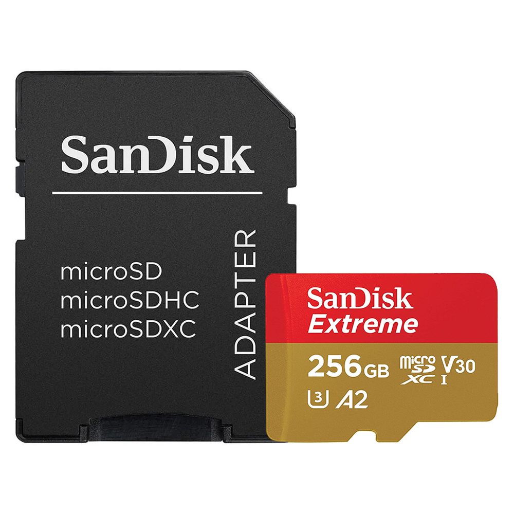 Karta SanDisk Extreme Micro SDXC se pyšní výrazným a funkčním designem. Samotná microSD karta je provedena v atraktivní červeno-zlaté barevné kombinaci. Horní červená část nese bílý nápis SanDisk Extreme, zatímco spodní zlatá část přehledně zobrazuje klíčové parametry jako kapacitu 256 GB a specifikace V30, U3 a A2. Přiložený adaptér je v elegantní černé barvě s bílým logem SanDisk a informacemi o kompatibilitě s formáty microSD, microSDHC a microSDXC, což podtrhuje jeho univerzálnost.