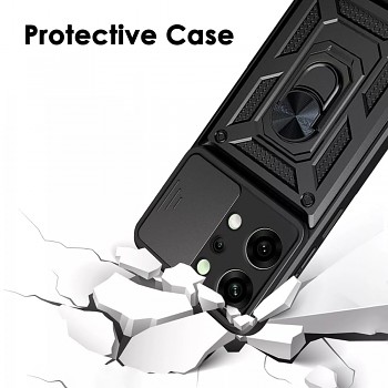 Pouzdro Techsuit CamShield Series se pyšní robustním a moderním designem, který nejen skvěle vypadá, ale především chrání. Jeho černá barva a taktický vzhled s geometrickými texturami na zadní straně zajišťují pevný úchop a dodávají telefonu osobitý styl. Klíčovým prvkem je integrovaný posuvný kryt fotoaparátu (CamShield), který efektivně chrání čočky před poškrábáním a nečistotami, když je nepoužíváte.