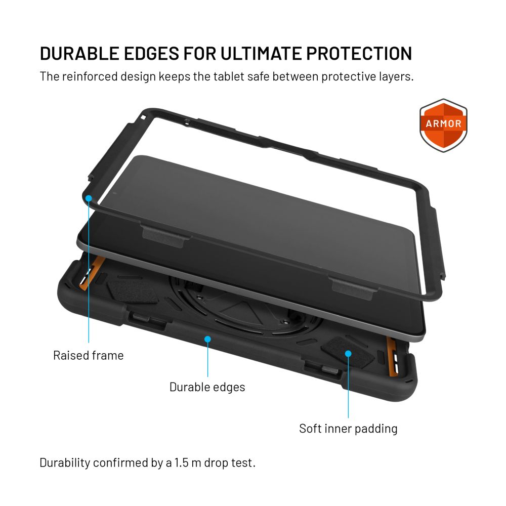 Pouzdro FIXED Rugged Tab se vyznačuje robustní a promyšlenou konstrukcí. Jeho základ tvoří pevný vnější rám se speciálně zesílenými rohy a boky, které spolehlivě absorbují veškeré otřesy a nárazy. Okraje pouzdra jsou mírně vyvýšené, čímž aktivně chrání displej před poškrábáním, když tablet položíte čelní stranou dolů. Vnitřní část je opatřena měkkým silikonovým polstrováním, které poskytuje další vrstvu tlumení a chrání tělo tabletu.