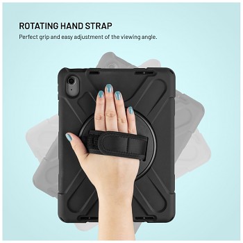 Na zadní straně se nachází dominantní prvek – otočná rukojeť. Tento úchopový mechanismus lze otáčet o celých 360°, což umožňuje mimořádně pohodlné a jisté držení v jakékoliv pozici. Pásek rukojeti si navíc můžete snadno přizpůsobit velikosti vaší ruky pomocí suchého zipu. Rukojeť zároveň slouží jako praktický výklopný stojánek pro stabilní horizontální polohu, ideální pro sledování filmů nebo videohovory. Design myslí i na detaily, jako je integrovaný slot pro stylus, ochranná krytka nabíjecího portu a úchyty v rozích pro připevnění popruhu.