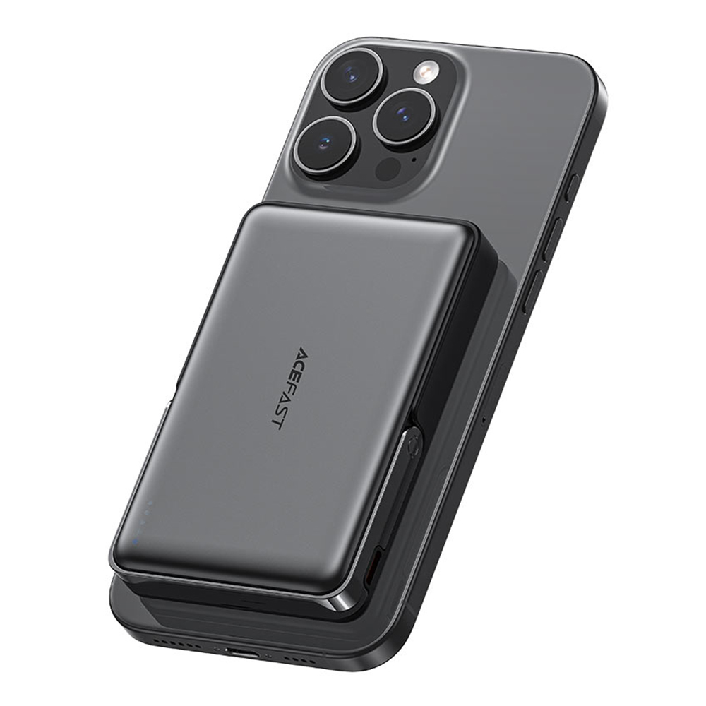 Powerbanka Acefast M17-10000 se pyšní minimalistickým a sofistikovaným designem. Její hladký povrch a zaoblené hrany působí velmi prémiově. Klíčovou vlastností je integrovaný skládací stojánek, který umožňuje pohodlné sledování obsahu na telefonu v horizontální i vertikální poloze, zatímco se zařízení nabíjí. Na zadní straně naleznete magnetický kroužek pro bezpečné a stabilní uchycení k telefonu, což zajišťuje optimální bezdrátové nabíjení. LED indikátor vás vždy informuje o aktuálním stavu nabití powerbanky.