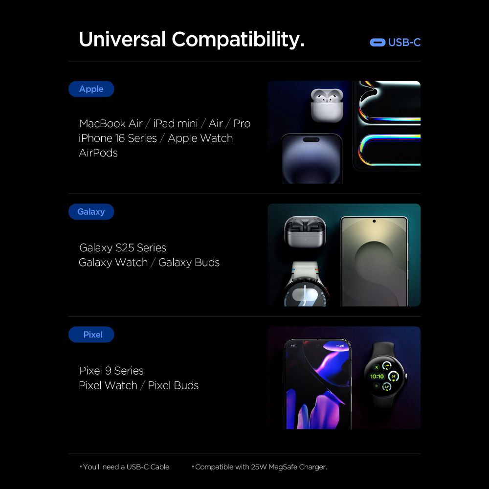Nabíječka Spigen Wall Charger Essential se pyšní minimalistickým a funkčním designem. Její matně černé provedení dodává produktu sofistikovaný vzhled, který se hodí do každého interiéru. Díky kompaktním rozměrům je ideální pro cestování i každodenní použití doma či v kanceláři. Dva přehledně umístěné USB-C porty zajišťují snadné připojení a efektivní nabíjení dvou zařízení současně.