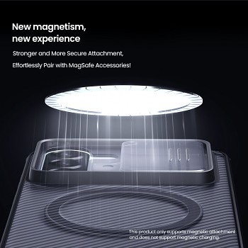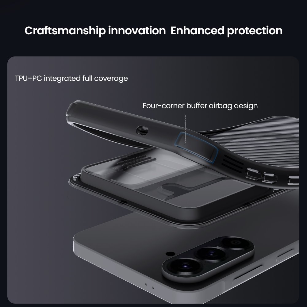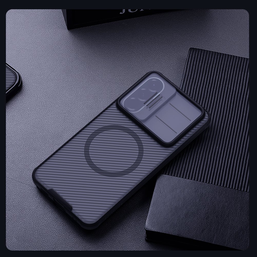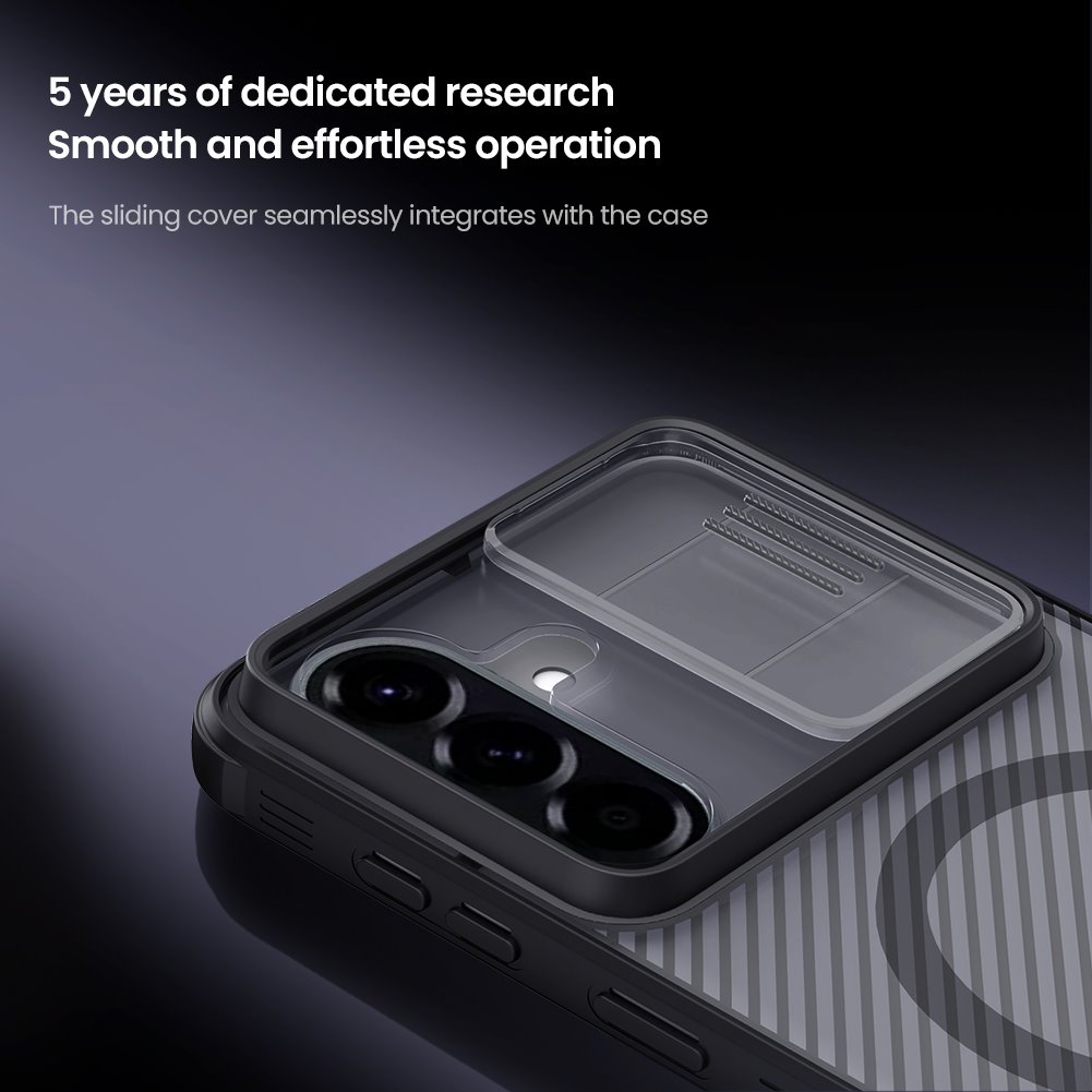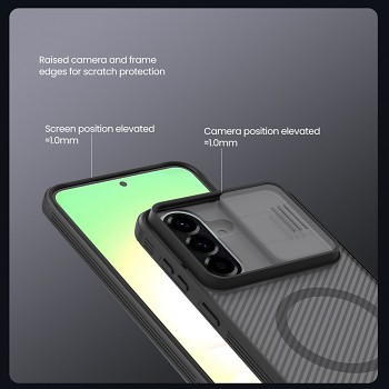 Kryt zadní magnetický Nillkin CamShield PRO pro Samsung Galaxy A57 průhledně černýKouřově poloprůhledný zadní díl disponuje rýhovanou texturou, pod kterou je elegantně zabudován modul s magnetem. Nepřehlédnutelným prvkem je bytelná posuvná roletka, tvořící neproniknutelný štít pro čočky fotoaparátu.