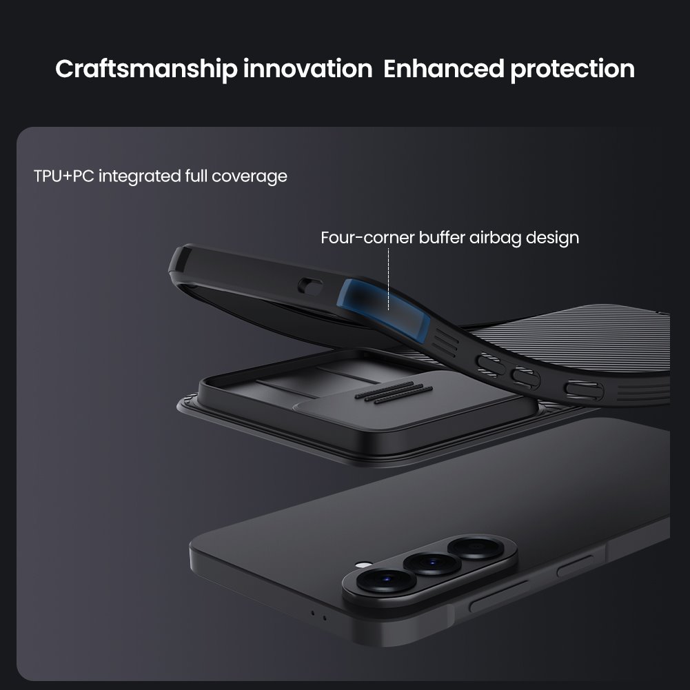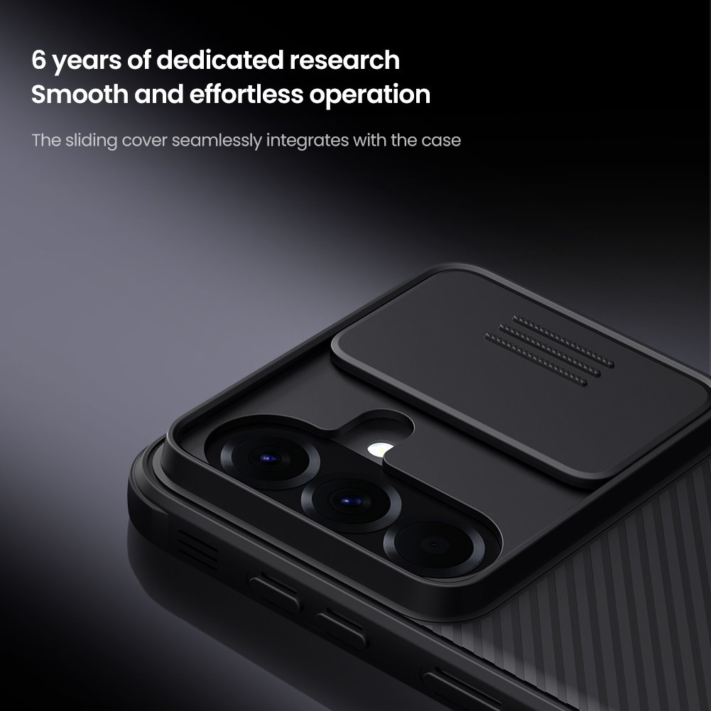 Kryt zadní Nillkin CamShield PRO pro Samsung Galaxy A57 černýČerný design s hrubší vertikální texturou na zádech dodává telefonu industriální a nekompromisní vzhled. Dominantním prvkem je ochranný posuvný panel v oblasti kamer. Rámy krytu využívají strukturované pruhování proti prokluzování v dlani.