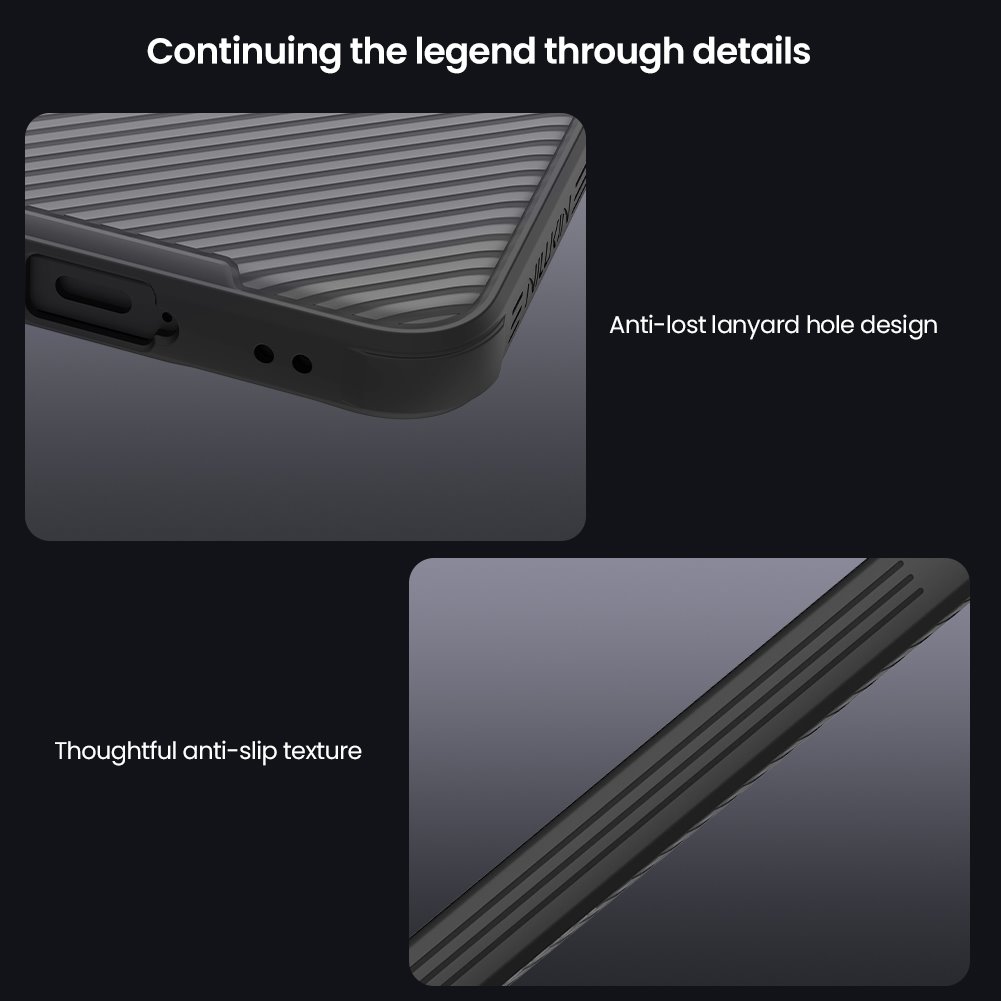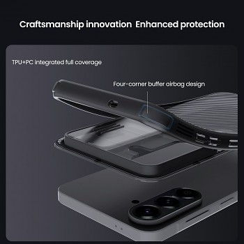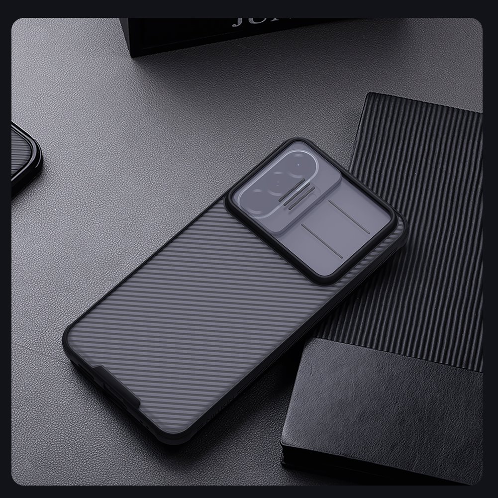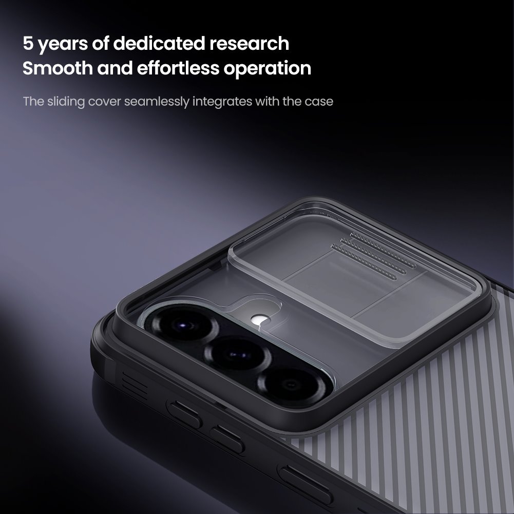 Kryt zadní Nillkin CamShield PRO pro Samsung Galaxy A57 průhledně černýKouřově poloprůhledný zadní díl disponuje jemnou rýhovanou texturou a elegantně přechází do výrazného posuvného štítu pro kamerový modul. Černě lemované okraje s dodatečným vzorováním bezpečně uzavírají siluetu zařízení.