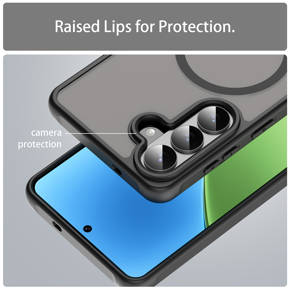 Kryt se pyšní poloprůhlednými matnými zády, která nechají vyniknout původní design vašeho telefonu, ale zároveň zabrání ulpívání otisků prstů. Viditelný magnetický kruh dává jasně najevo podporu MagSafe. Boky krytu jsou vyrobeny z pružného, ale odolného materiálu s protiskluzovou úpravou pro jistý a pohodlný úchop. Zesílené rohy poskytují zvýšenou ochranu při pádech a precizní výřezy zaručují bezproblémový přístup ke všem portům a funkcím. Rámeček kolem fotoaparátu je mírně vyvýšený, aby chránil čočky před poškrábáním.