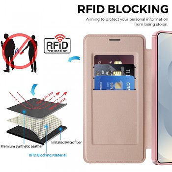 Pouzdro na první pohled zaujme svým minimalistickým designem s jemně strukturovaným povrchem, který je velmi příjemný na dotek a zabraňuje vyklouznutí z ruky. Konstrukce typu kniha poskytuje kompletní ochranu zařízení ze všech stran. Vnitřní strana klopy obsahuje praktický slot na platební kartu nebo doklady, zatímco vnitřní vanička z pružného materiálu zajistí, že telefon bude v pouzdře sedět jako ulitý. Díky přesným výřezům zůstává přístup k fotoaparátům, konektorům i reproduktorům zcela neomezený.