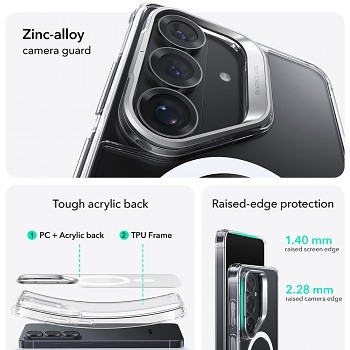 ESR klasické hybridní pouzdro se stojánkem HaloLock pro Samsung Galaxy S26, průhlednéTento kryt se pyšní minimalistickým a funkčním designem. Jeho zcela průhledné provedení nechá vyniknout originální barvu vašeho telefonu, zatímco precizní konstrukce zajišťuje dokonalé přilnutí. Dominantním prvkem je inovativní nastavitelný stojánek, který je chytře integrovaný kolem modulu fotoaparátu. Tento stojánek zároveň slouží jako silný magnetický kruh pro systém HaloLock™. Kryt má zesílené rohy pro zvýšenou ochranu při pádech a přesné výřezy pro všechna tlačítka a porty.