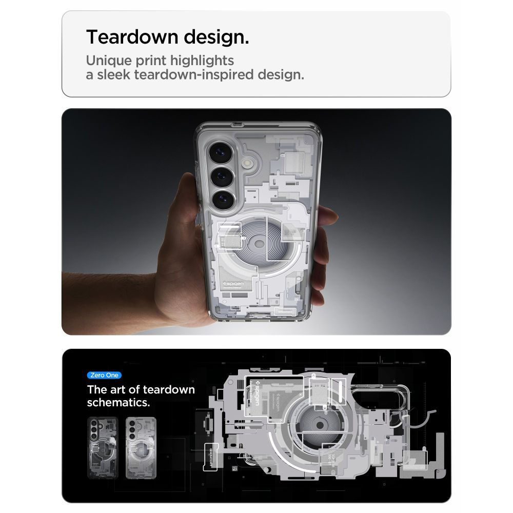 Kryt Spigen - Ultra Hybrid MagSafe (ACS10737) - Samsung Galaxy S26 Zero One bílýDesign a zpracování: Specifický design Zero One White se vyznačuje poloprůhlednými zády se světlým grafickým potiskem vnitřních technologických součástek telefonu. Hlavním materiálem zadní desky je tvrzený polykarbonát, který po obvodu doplňuje měkčený TPU rámeček.