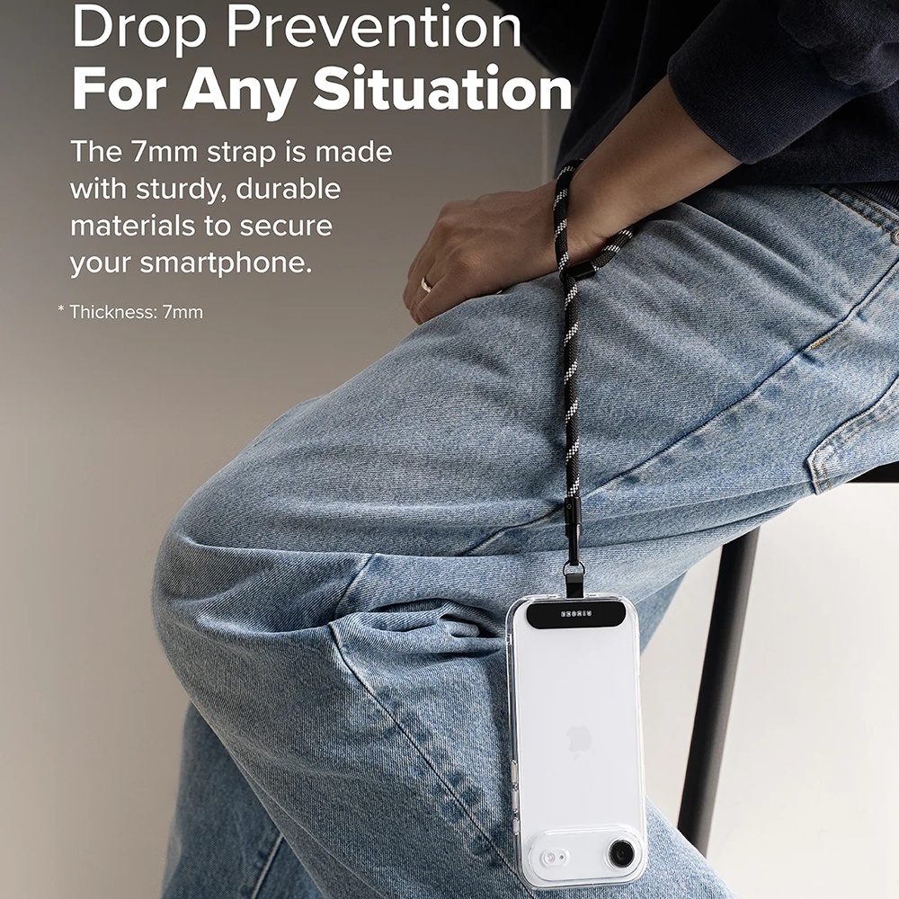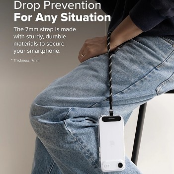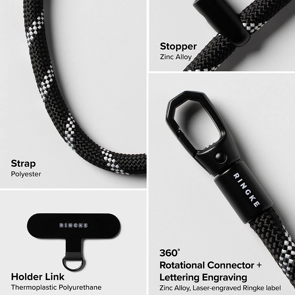 Popruh Link Flow P-Type se vyznačuje elegantním a funkčním designem v odstínu černá. Je vyroben z odolného, pleteného materiálu v kombinaci černé a bílé barvy, který připomíná horolezecké lano, což zaručuje vysokou pevnost a dlouhou životnost. Díky nastavitelné délce si můžete popruh přizpůsobit podle svých potřeb, ať už jej chcete nosit jako crossbody šňůrku přes rameno, nebo jako popruh na ruku. Černé plastové komponenty pro nastavení a uchycení dodávají celkovému vzhledu moderní a minimalistický nádech. Součástí je i tenká, ale robustní podložka s logem Ringke, která se vkládá do pouzdra telefonu a umožňuje snadné a bezpečné připojení popruhu.