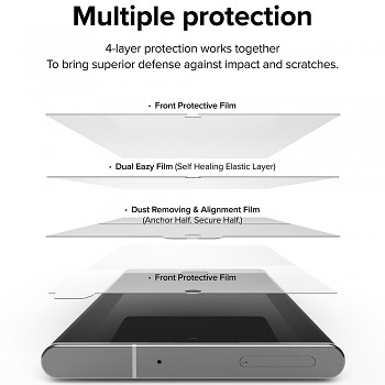 Design fólie Ringke Dual Easy Full je navržen s důrazem na minimalismus a funkčnost. Díky své čiré a tenké konstrukci je po aplikaci prakticky neviditelná a nijak nenarušuje původní vzhled ani jas displeje. Její flexibilita umožňuje precizní pokrytí celého displeje, včetně zakřivených hran, a poskytuje tak komplexní ochranu proti poškrábání a drobným oděrkám, aniž by přidávala na objemu. Proces instalace je díky inovativní technologii Dual Easy maximálně zjednodušen, což umožňuje rychlou a bezproblémovou aplikaci i pro nezkušené uživatele.