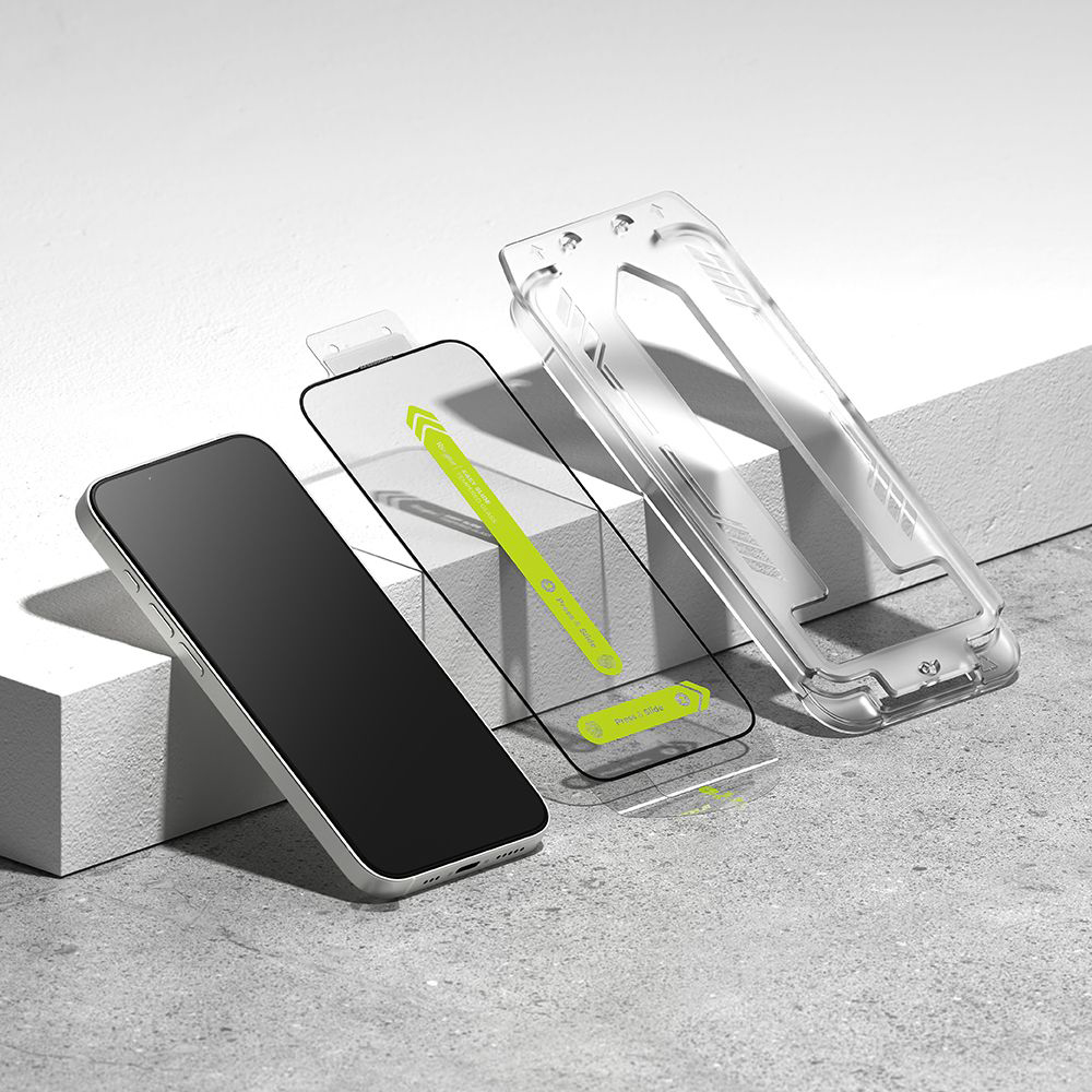 Design skla je křišťálově čistý a tenký, což zajišťuje, že si zachováte plnou vizuální kvalitu displeje bez zkreslení. Jednou z největších předností je inovativní instalační rámeček "Easy Slide", který umožňuje extrémně snadnou a přesnou aplikaci bez bublin. Jednoduše umístíte rámeček na telefon, zasunete sklo a máte hotovo. Tento systém minimalizuje riziko chyb při instalaci a zajišťuje dokonalé přilnutí. Sklo je navrženo s ohledem na "Case Friendly" kompatibilitu, což znamená, že je plně kompatibilní s většinou ochranných pouzder Ringke i jiných značek, aniž by docházelo k jeho odlepování na okrajích.