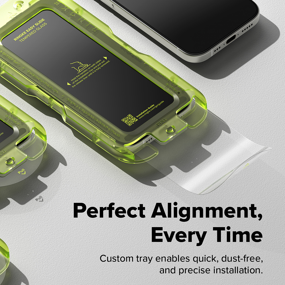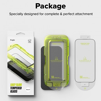 Jedinečnost tohoto produktu spočívá v inovativním systému Easy Slide. Součástí balení je speciální zelený instalační rámeček, který umožňuje rychlou, bezprašnou a precizní instalaci bez bublin. Stačí telefon umístit do rámečku, přiložit sklo a posunout – Perfect Alignment, Every Time. Tento "Case Friendly" design je precizně navržen tak, aby byl 100% kompatibilní s pouzdry Ringke a nedocházelo ke zvedání okrajů skla.
