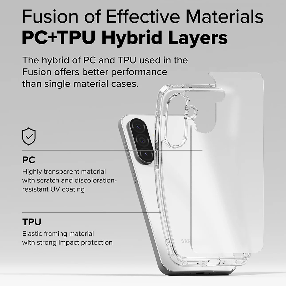 Kryt Ringke Fusion je mistrovským dílem hybridního designu, který spojuje to nejlepší ze dvou světů. Zadní strana je vyrobena z tvrdého polykarbonátu (PC), který je vysoce transparentní, odolný proti poškrábání a opatřený UV vrstvou zabraňující žloutnutí. Rámeček krytu tvoří flexibilní termoplastický polyuretan (TPU), který efektivně pohlcuje nárazy a poskytuje silnou ochranu proti pádům. Matně průhledná úprava zadní strany dodává elegantní vzhled a zároveň minimalizuje viditelnost otisků prstů.