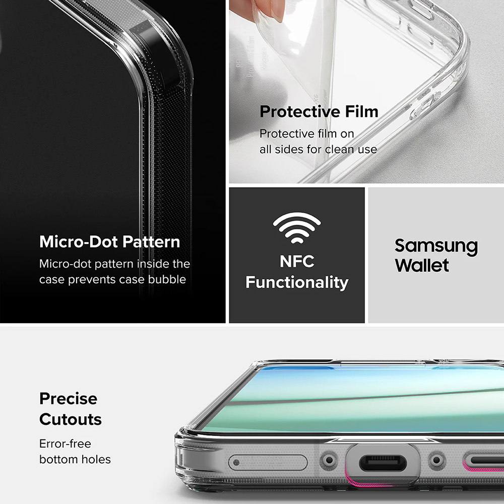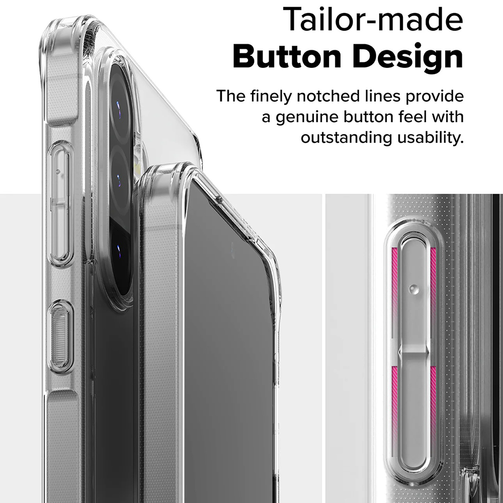 Design krytu je promyšlen do posledního detailu. Tlačítka jsou navržena na míru s jemně vroubkovanými liniemi, které zajišťují autentický pocit stisku a vynikající použitelnost. Pro maximální ochranu displeje a fotoaparátu jsou okraje krytu zvýšené – 1,5 mm pro displej a 1,2 mm pro modul fotoaparátu. Uvnitř krytu naleznete mikrotečkovaný vzor, který zabraňuje vzniku nevzhledných "bublin" a přilnutí krytu k telefonu. Samozřejmostí jsou přesné výřezy pro všechny porty a funkce, včetně plné kompatibility s NFC funkcionalitou a Samsung Wallet. Pro extra ochranu při pádech jsou v rozích krytu integrovány vzduchové kapsy, které splňují vojenský standard odolnosti MIL STD 810G-516.6 USA. Kryt je dodáván s ochrannou fólií na všech stranách pro bezchybné použití.