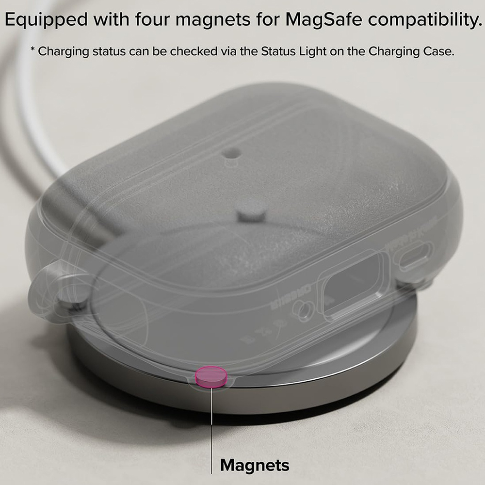 Jednou z klíčových vlastností je integrovaná magnetická technologie se čtyřmi magnety, která zajišťuje kompatibilitu s MagSafe příslušenstvím a umožňuje pohodlné bezdrátové nabíjení. Pro maximální praktičnost je pouzdro vybaveno otvorem pro karabinu a součástí balení je i robustní karabina, díky které můžete svá sluchátka bezpečně připnout k batohu, klíčům nebo tašce a mít je vždy po ruce.
