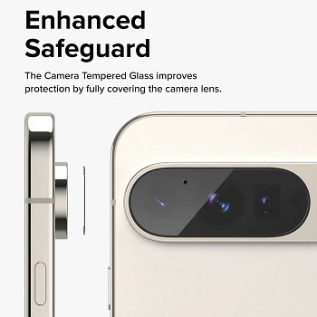 Ochranné sklo Ringke je navrženo s extrémní precizností, aby dokonale kopírovalo tvar modulu fotoaparátu Google Pixel 9 Pro. Jak je patrné z obrázku, jedná se o jednolitý kus skla, který elegantně překrývá celou oblast fotoaparátu, včetně všech objektivů a senzoru. Díky tenkému profilu a čirému provedení je sklo na telefonu téměř neviditelné a zachovává originální estetiku zařízení. Přesné výřezy pro blesk a mikrofon zajišťují plnou funkčnost fotoaparátu bez jakýchkoli kompromisů. Sklo je navrženo tak, aby bylo "Case Friendly", což znamená, že je plně kompatibilní s většinou ochranných pouzder, včetně těch od značky Ringke, a zabraňuje nežádoucímu zvedání okrajů.