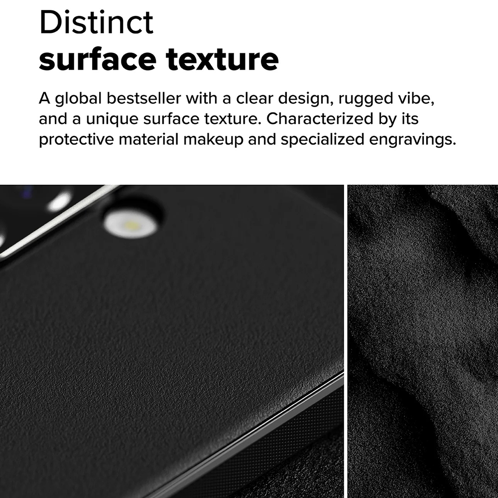 Kryt Ringke Onyx je vyroben z flexibilního TPU (termoplastického polyuretanu), který je známý svou odolností a schopností pohlcovat nárazy. Jeho povrch zdobí jedinečná, jemně texturovaná úprava s kulatým embosovaným vzorem na obou stranách, která nejenže dodává krytu moderní a robustní vzhled, ale také zajišťuje výjimečně pevný a protiskluzový úchop. Díky tomu se telefon drží v ruce jistěji a minimalizuje se riziko vyklouznutí.