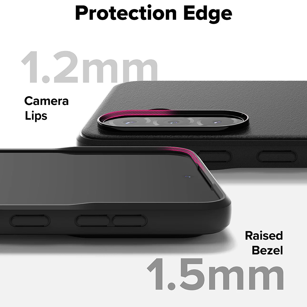 Design krytu Ringke Onyx je pečlivě promyšlen do posledního detailu. Zvýšené okraje kolem displeje s výškou 1,5 mm poskytují efektivní ochranu proti poškrábání a nárazům při položení telefonu displejem dolů. Stejně tak jsou chráněny i fotoaparáty, díky zvýšeným okrajům o 1,2 mm, které zabraňují přímému kontaktu čoček s povrchem. Tlačítka jsou navržena na míru s jemnými vroubkovanými liniemi, což zajišťuje autentický pocit stisku a vynikající ovladatelnost. Kryt je v elegantní černé barvě, která podtrhuje jeho sofistikovaný vzhled.