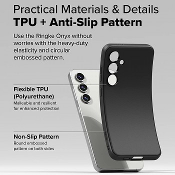 Pouzdro Ringke Onyx v elegantní černé barvě se pyšní moderním a funkčním designem. Je vyrobeno z vysoce odolného a flexibilního TPU (termoplastického polyuretanu), které je známé svou pružností a schopností pohlcovat nárazy. Jeho povrch zdobí výrazná textura se speciálním embosováním, které dodává pouzdru robustní vzhled a zároveň zajišťuje protiskluzové vlastnosti pro pevný a jistý úchop. Precizně navržené výřezy pro tlačítka poskytují optimální odezvu a pohodlné používání všech funkcí telefonu.