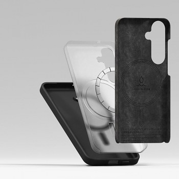 Pouzdro Ringke Silicone Magnetic MagSafe se pyšní minimalistickým a sofistikovaným designem. Jeho matný černý povrch z jemného silikonu je příjemný na dotek a zajišťuje pevný úchop, čímž minimalizuje riziko vyklouznutí telefonu z ruky. Precizní výřezy pro fotoaparáty, tlačítka a porty zaručují plnou funkčnost a snadný přístup ke všem ovládacím prvkům. Vnitřní strana pouzdra je opatřena měkkou podšívkou, která chrání zadní stranu telefonu před poškrábáním. Dominantním prvkem je integrovaný magnetický kroužek MagSafe, který umožňuje rychlé a stabilní připojení kompatibilního příslušenství, jako jsou bezdrátové nabíječky nebo peněženky.