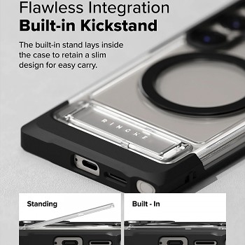Pouzdro Ringke UX Magnetic se pyšní hybridní konstrukcí, která je pro značku Ringke typická. Zadní strana je vyrobena z vysoce transparentního a tvrdého polykarbonátu (PC), který je odolný proti poškrábání a žloutnutí, a umožňuje tak plně vyniknout designu vašeho Samsungu Galaxy S25 Ultra. Okraje a rohy jsou zesíleny flexibilním a nárazy pohlcujícím TPU rámečkem v elegantní černé barvě, který efektivně rozptyluje nárazy a poskytuje maximální ochranu.