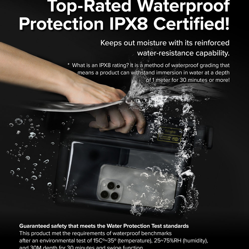 Ringke Vodotěsná taška s popruhem IPX8 240x180mm černáPředstavujeme vám Ringke Vodotěsnou tašku s popruhem – nepostradatelného společníka pro všechna vaše dobrodružství, kde je ochrana elektroniky a cenností klíčová. Tato taška, navržená s důrazem na maximální bezpečnost a funkčnost, je ideální pro pláž, bazén, vodní sporty nebo jakékoli aktivity v deštivém počasí.